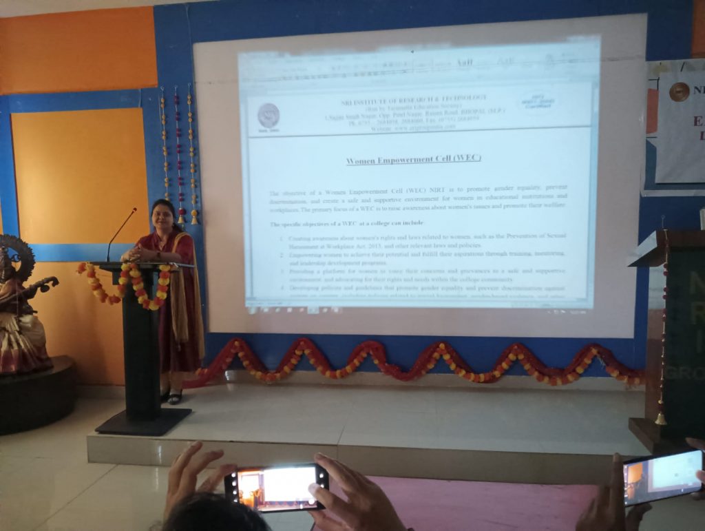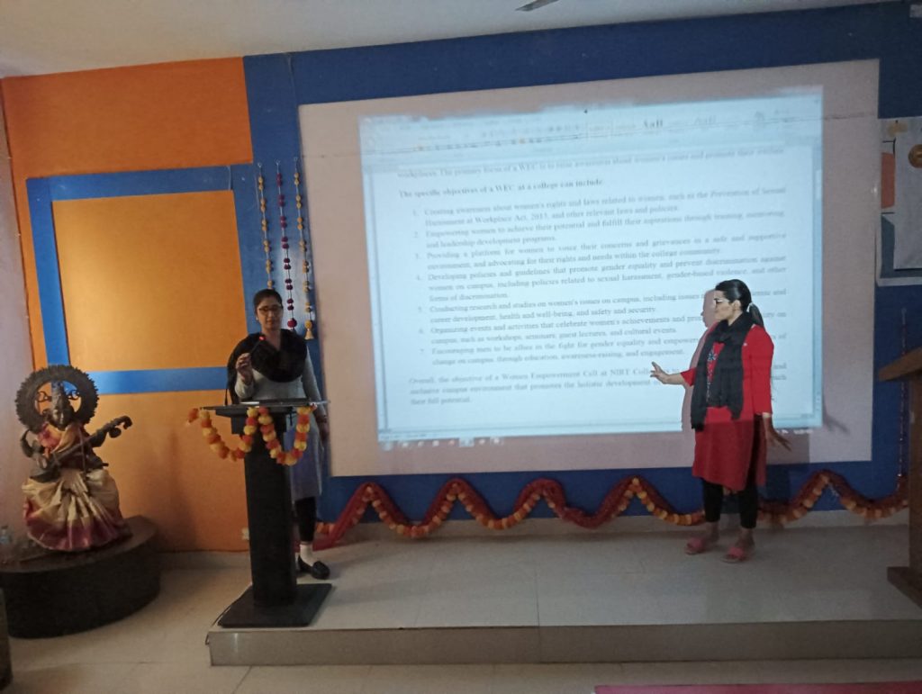 The Women Empowerment Cell (WEC) at NIRT College plays an important role in promoting gender equality, preventing discrimination and creating a safe and supportive environment for women on campus. The roles and responsibilities of a WEC at a college can include: